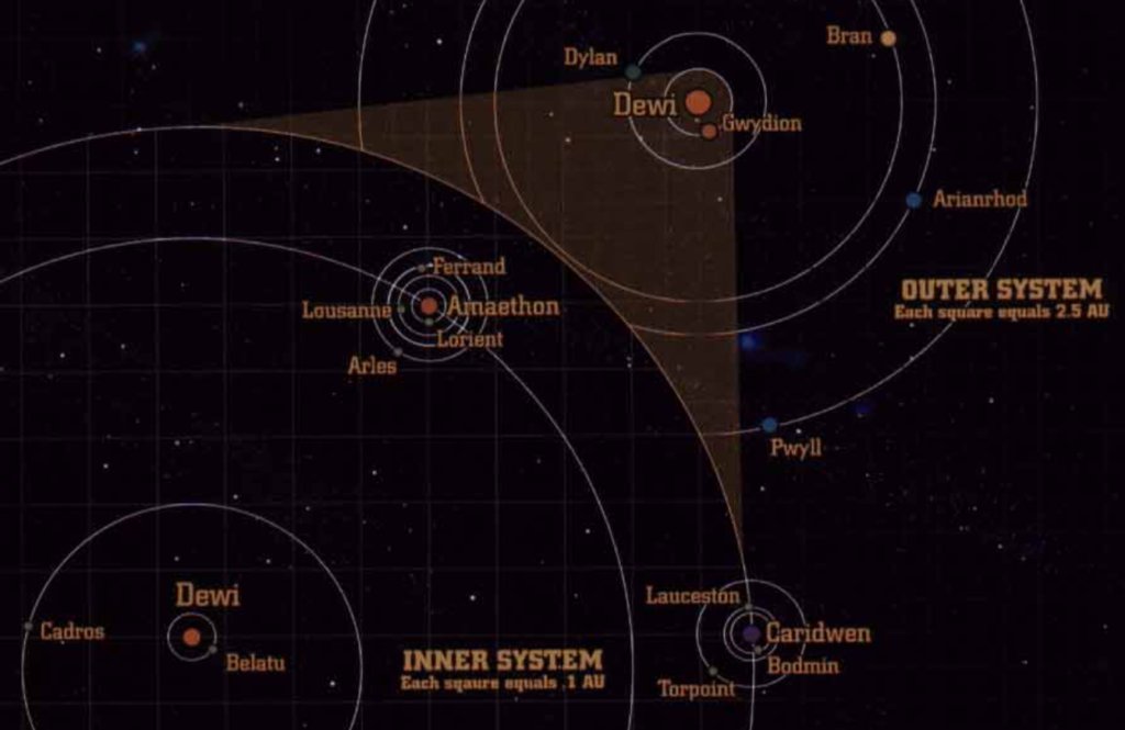 - Caridwen – the smaller of two gas giants in Dewi’s habitable zone; 10 moons