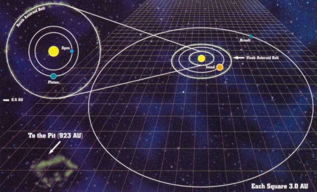 - Bruelt – a tiny planetoid 31AU distant which marks the system’s edge