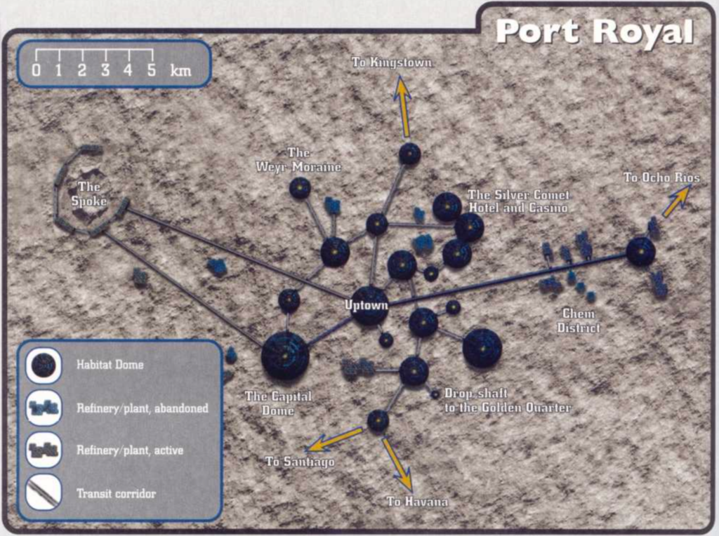 One of the oldest cities in the Verge, Port Royal’s habitat domes and subterranean galleries are home to almost half a million people. Previously an industrial settlement, it is now a tourist town where literally anything goes. Accommodation ranges from cheap flophouses to 4-star hotels.