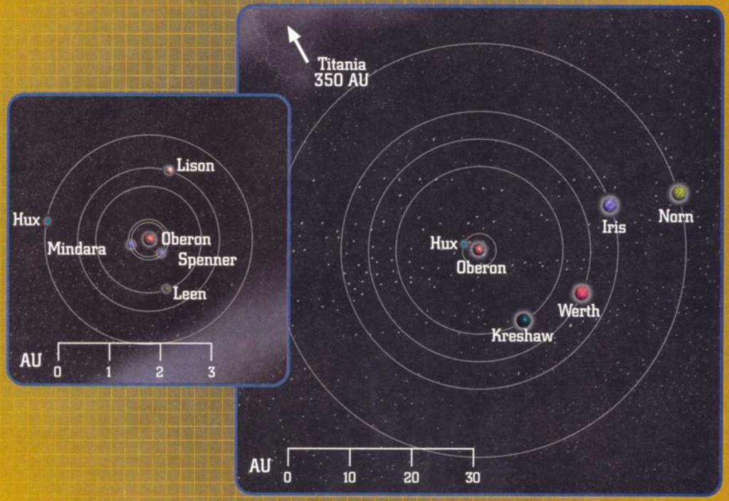 A large system containing two stars separated by 350AU – the planetless blue supergiant, Titania, and Oberon, with its nine worlds.