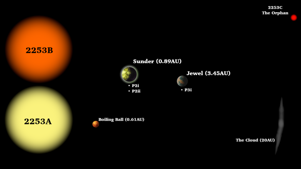 - Sunder (P2) – an incredibly unstable super-earth with two tiny moons, P2i & P2ii